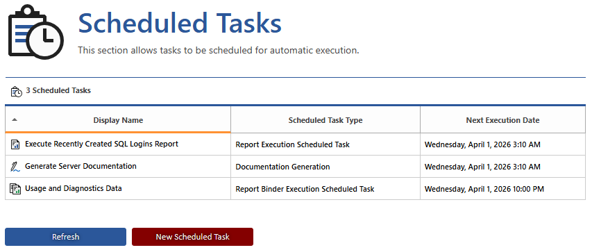Scheduled tasks can be configured to be executed by the scheduler on the specified schedule. Scheduled tasks can also be managed using the PowerShell API.