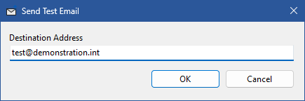 The dialog allows a test email to be sent using the configured SMTP settings.