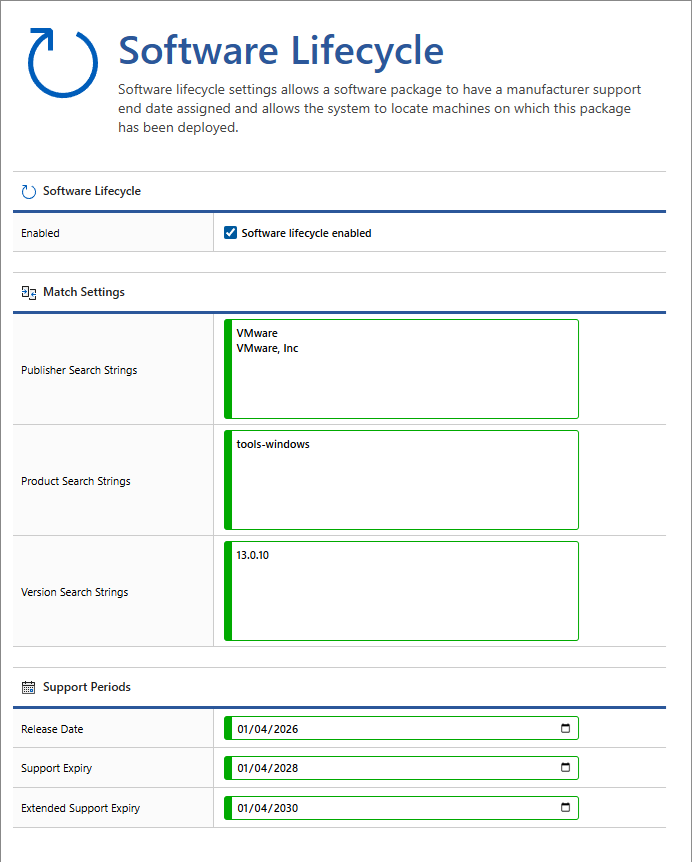 The software lifecycle allows you to determine where the software package is installed on machines within the environment by assigning search parameters and the manufacturer assigned support and extended support end dates.