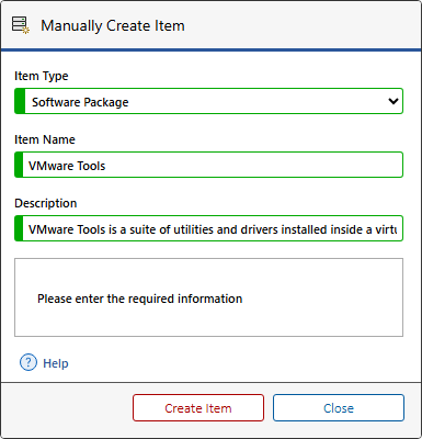 All software package items must be created manually using the new item dialog.