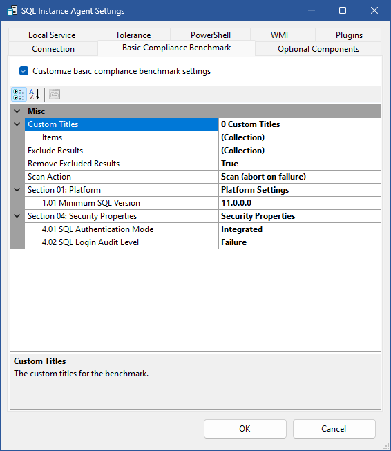 The SQL Instance Basic Compliance Benchmark has the following configurable options