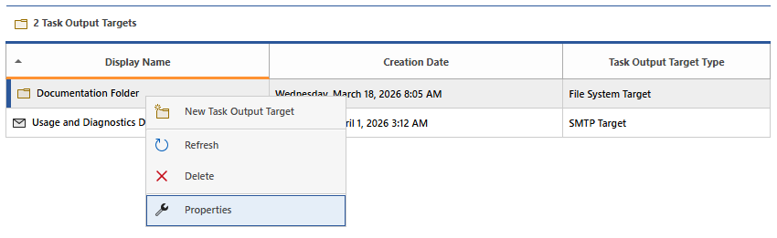 The context menu is displayed when a user right clicks a task output target.