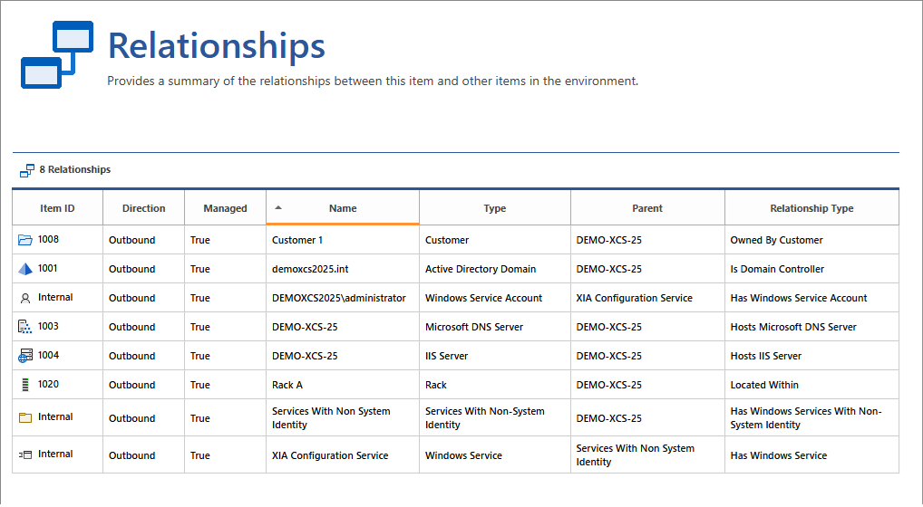 The relationships section displays the relationships between an item and other items within the system.