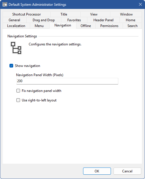 Determines the width of the navigation panel at start-up in pixels. The value must be at least 100 pixels.