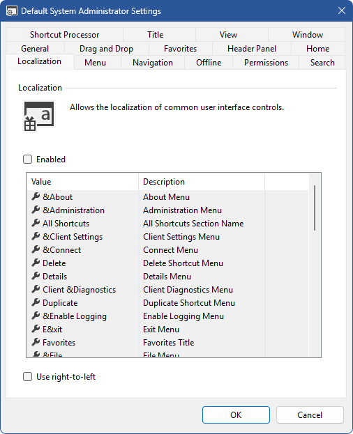 The localization settings allows users to specify custom text to display for common user interface items.