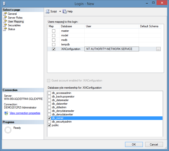 - On the User Mapping tab, select the XIA Configuration database and ensure that db_owner is ticked: