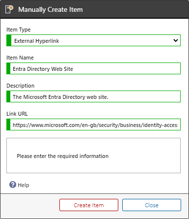 - Select the relevant item type from the drop down list. Note: the items in this list can be configured in the manual item creation settings.