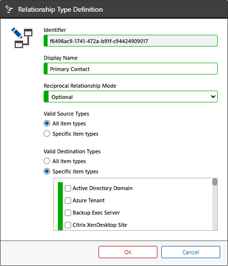 The relationship type definition dialog allows a relationship type to be created or modified.