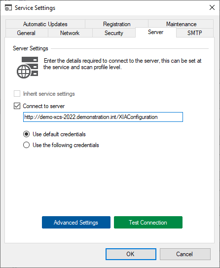 The server settings tab allows the configuration of a XIA Configuration Server connection. These settings are used for automatic updates and also as the settings to use for each scan profile, unless overridden.
