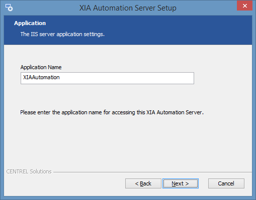 - Enter the application name, this is used to form the URL at which XIA Automation Server can be accessed and click Next.