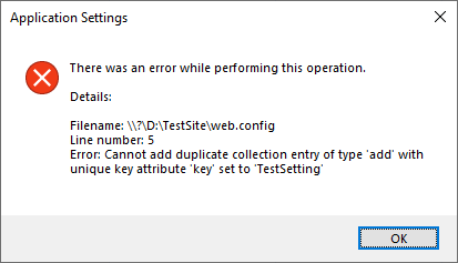 App Settings: Cannot add duplicate collection entry of type 'add' with unique key attribute 'key'