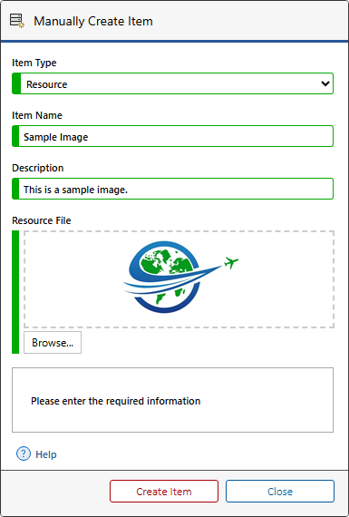- For resource item types, you must browse to a resource file to assign.