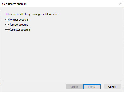 - Add the Certificates snap-in and ensure that Computer account is selected (using the Server account option is not supported)