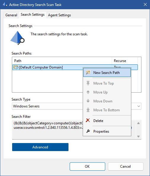 The context menu is displayed when a search path is right clicked in the search settings user interface.