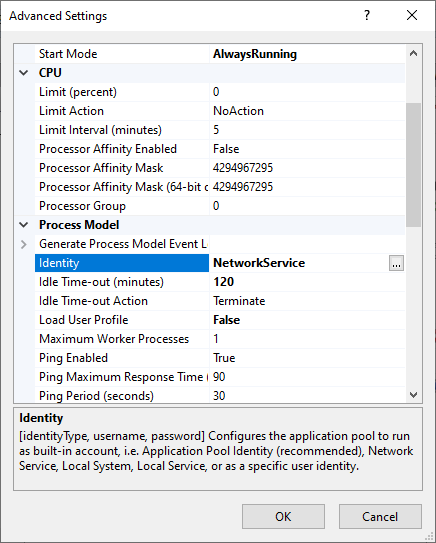 • Set the Account value to be "NT AUTHORITY\NETWORKSERVICE" when using the Network Service* account, or the full account name of the custom web server account**.