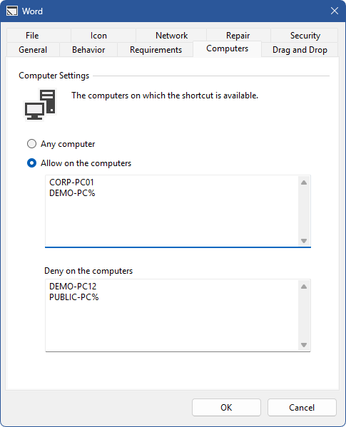 The shortcut is available on the computers with the specified NetBIOS names. The % wildcard can be used at the start or end of the computer name.