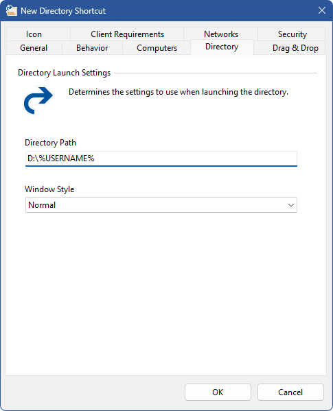 The directory tab specifies directory related settings for the directory shortcut.