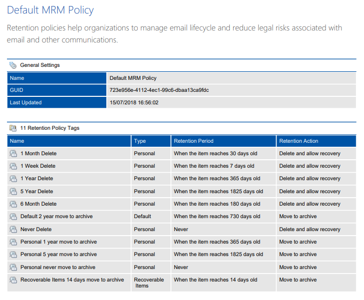 This section includes information on retention tags configuration such as name, retention action, retention period and type.