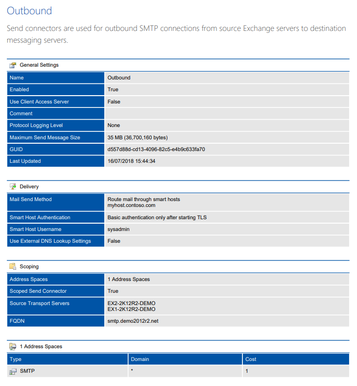 This section includes information on send connectors configuration such as name, delivery, scoping and address spaces.